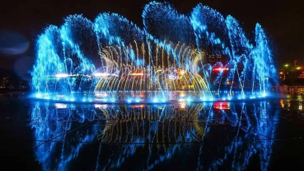 A musical fountain is a water display that combines synchronized water jets with music and light effects. The fountain’s water movements are controlled to match the rhythm and beat of the music. Advanced technology is used to ensure that the water jets, lighting, and sometimes additional effects like lasers or fire, are perfectly synchronized with the sound. It provides a mesmerizing visual and auditory experience for viewers.