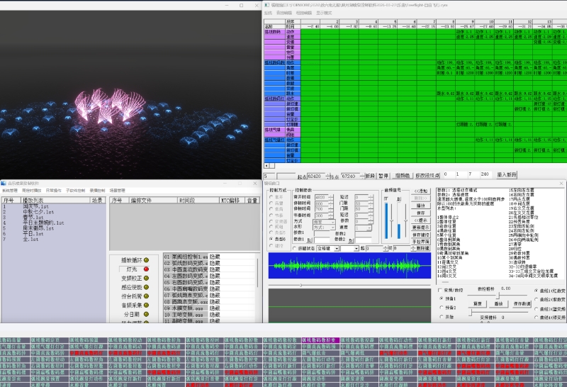 The system supports particle-level 3D real-time preview, supports importing MIDI/DMX cue lists, supports automatic switching between multiple tracks in the playlist, and supports remote monitoring.